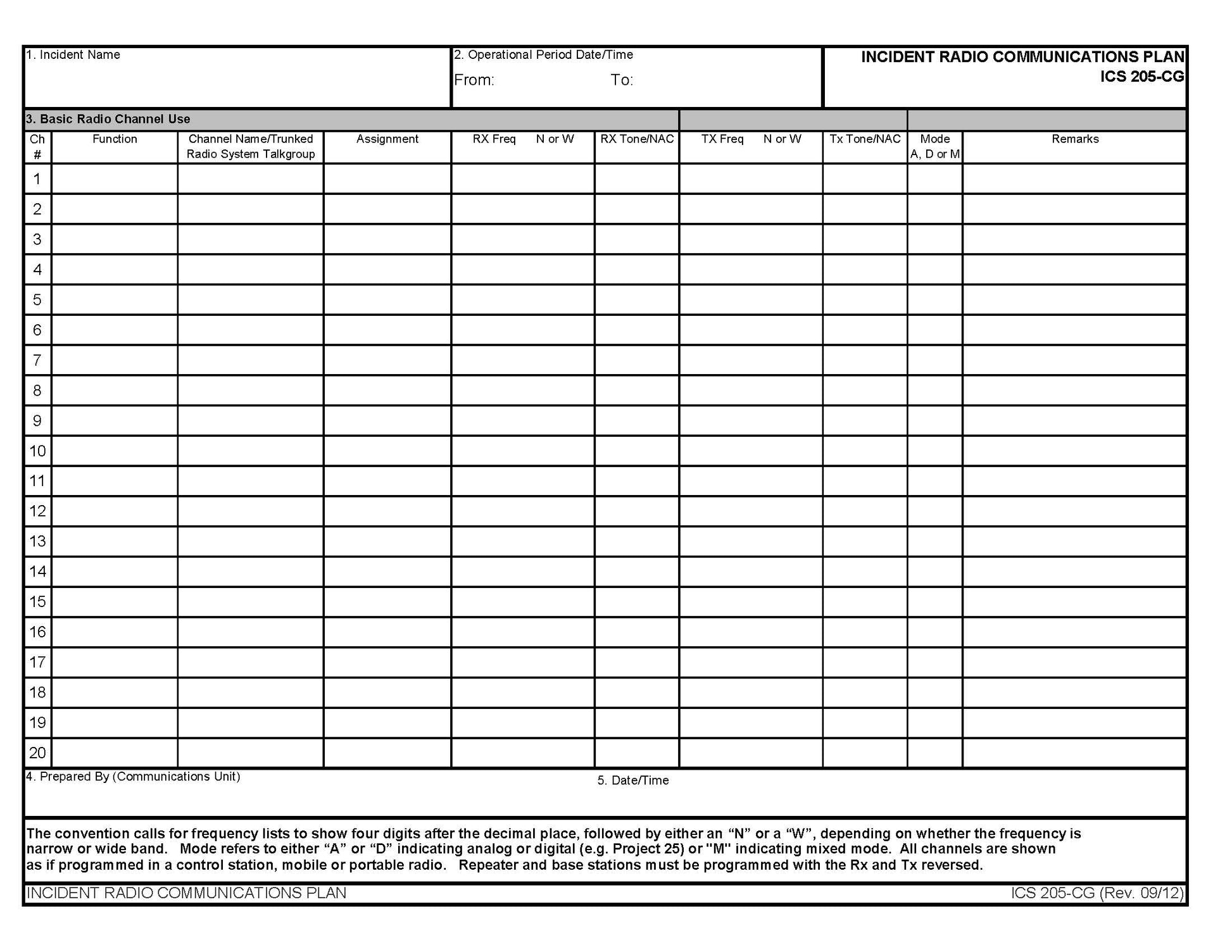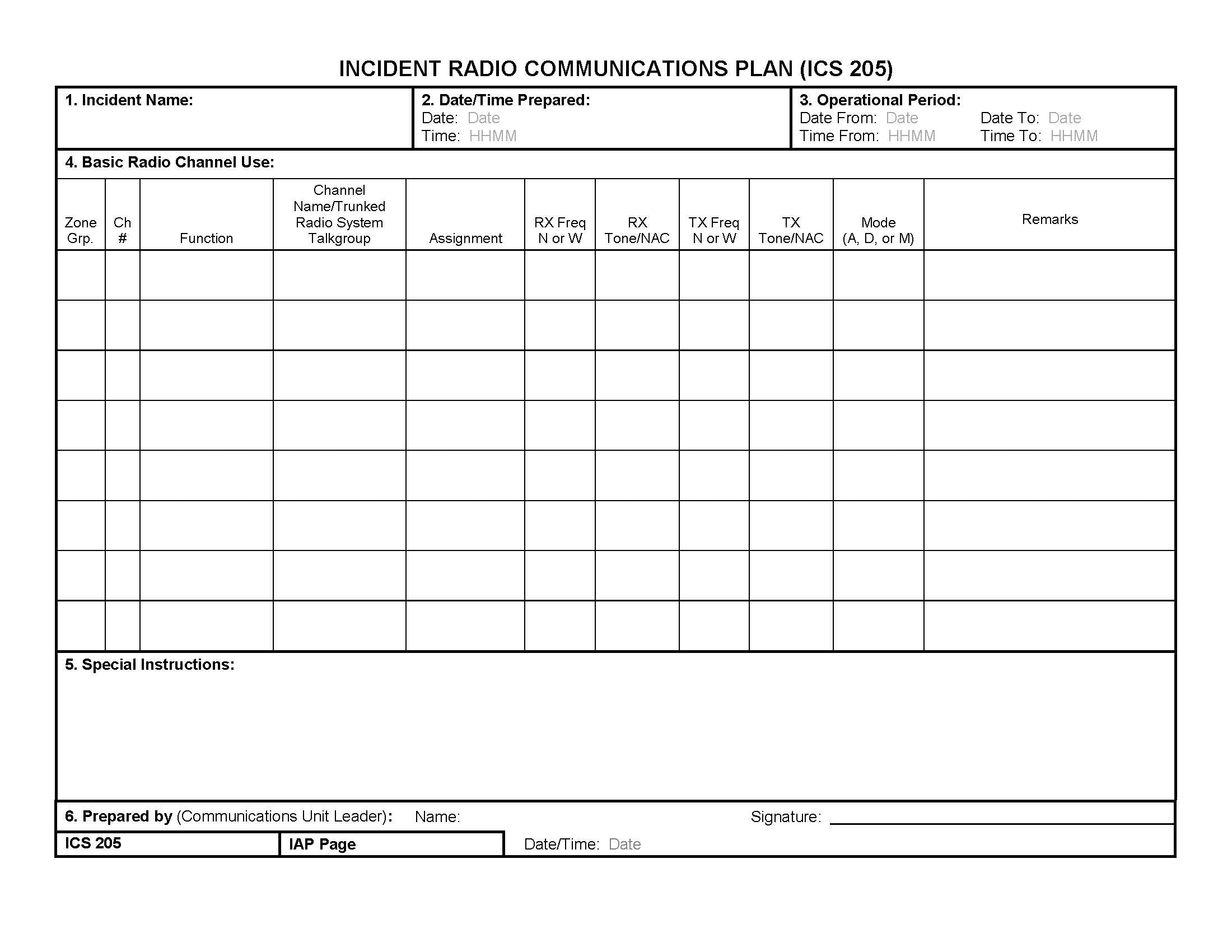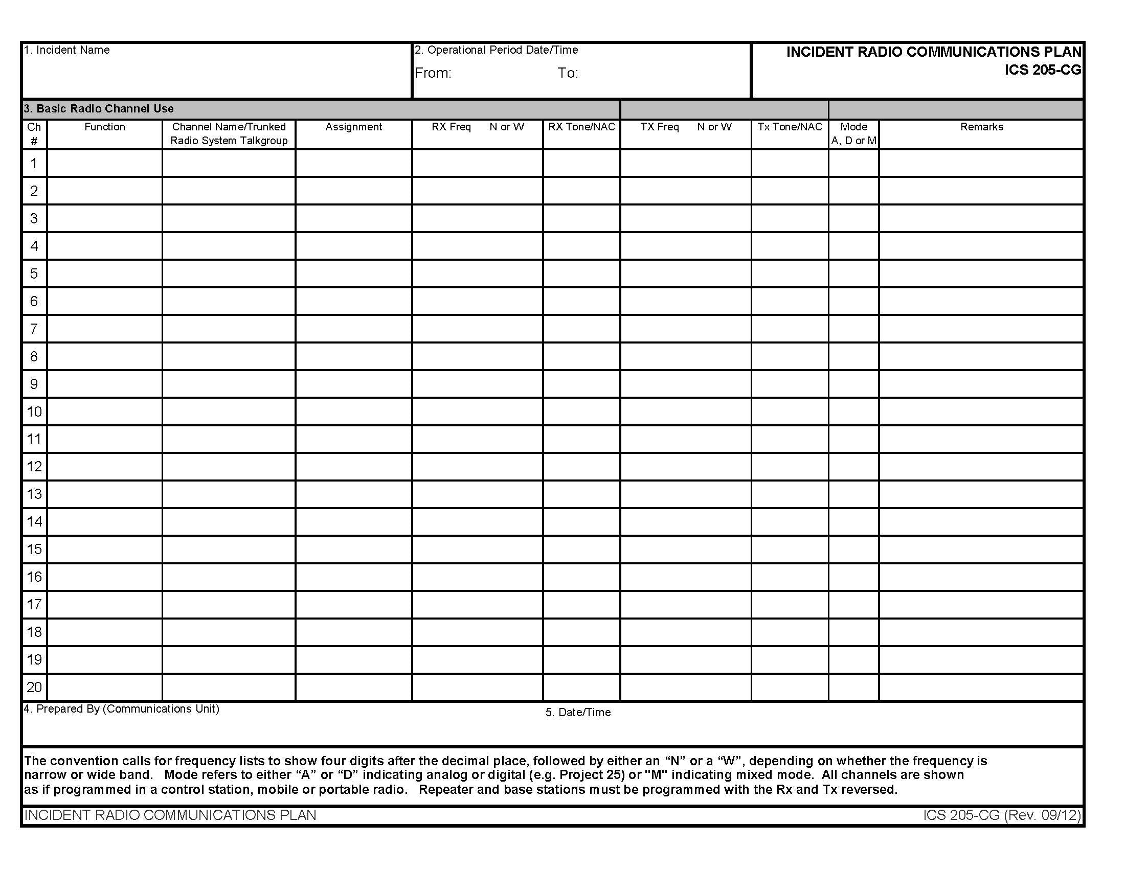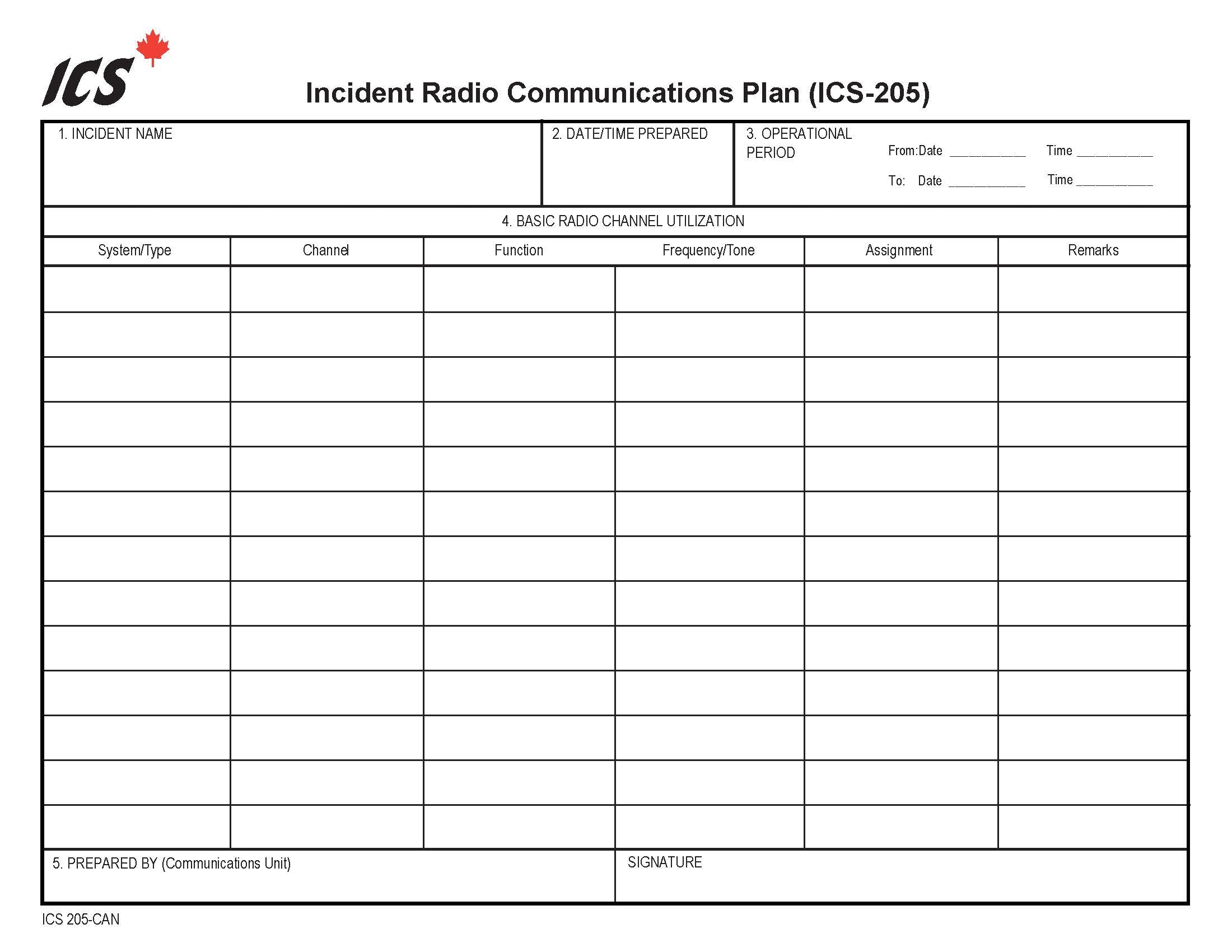ICS-205 Incident Radio Communication Plan Form